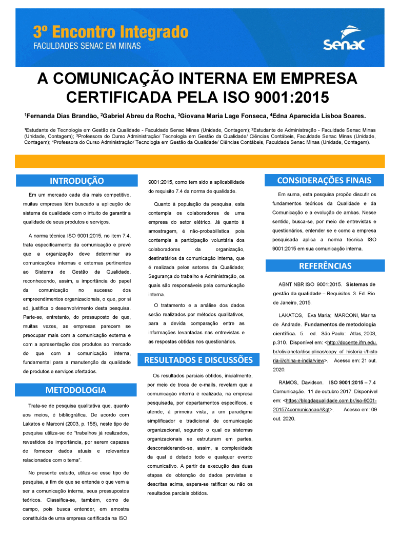 Trabalho acadêmico: 00_A COMUNICAÇÃO INTERNA EM EMPRESA CERTIFICADA PELA ISO 90012015. UNIDADE CONTAGEM